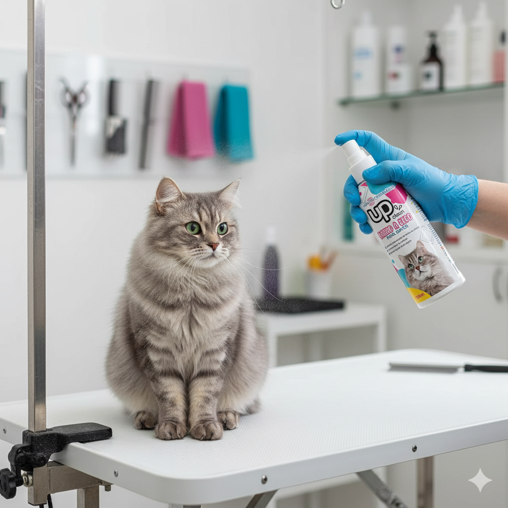 Modo de uso: Separe lo pelos de su mascota con las manos y aplique el producto directamente en el pelo, a una distancia aproximada de 10 ó 15cm. Con ayuda de una paño suave y seco, extienda por todo el pelaje, enseguida pasar otro paño seco para retirar el exceso. No precisa enjuagar.