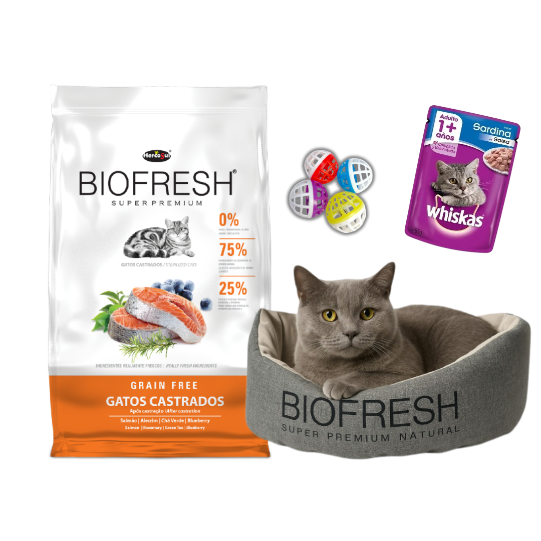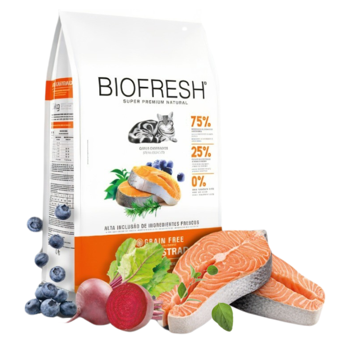 Biofresh Super Premium para Gatos Castrados es innovador y diferente, porque tiene alta inclusión de carnes frescas con un toque de vegetales y frutas nobles. El resultado es un alimento Grain Free (libre de granos), completo y balanceado, que se destaca por elevar la nutrición de los carnívoros a su más alto nivel. La tecnología Biofresh garantiza la conservación de este alimento de forma 100% natural y segura, sin conservantes artificiales añadidos.