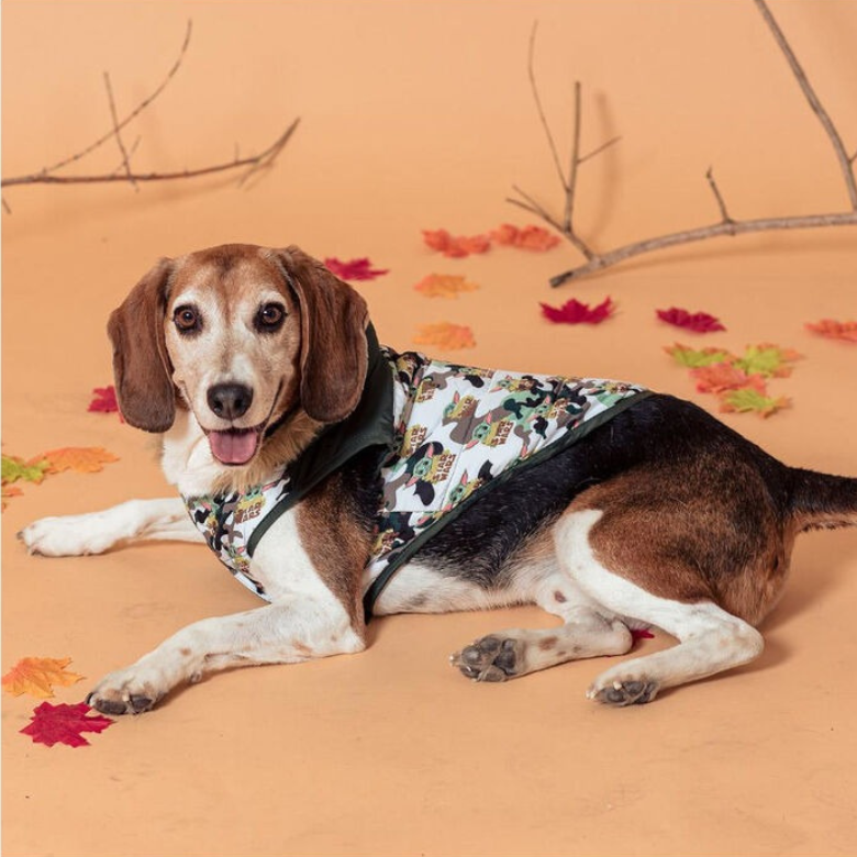 Esta campera para perros con estampado de Mandalorian de Disney ofrece a tu mascota un fantástico accesorio que lo protegerá del frío durante sus paseos. Tiene una capucha con muchas plumas de pelo largo para que puedas colocársela a tu mascota mimada cuando lo desees.
