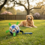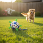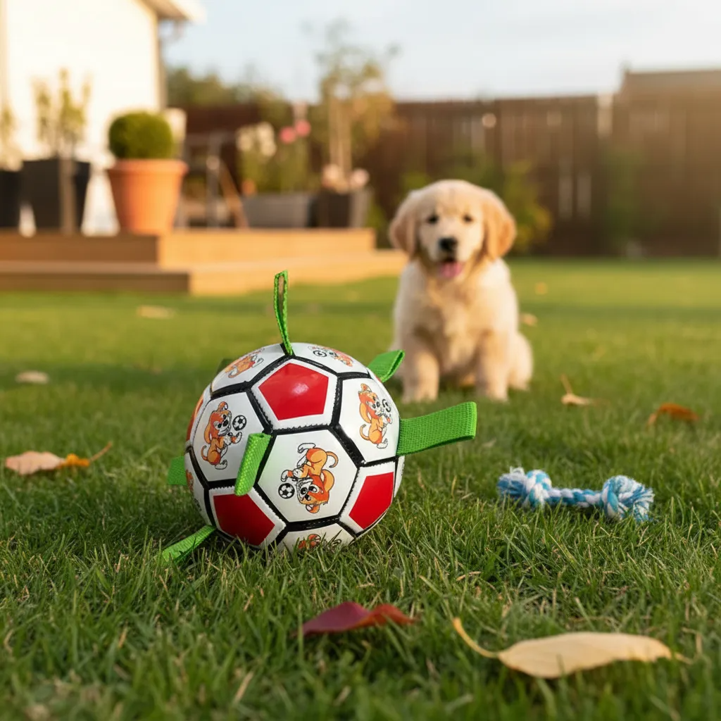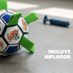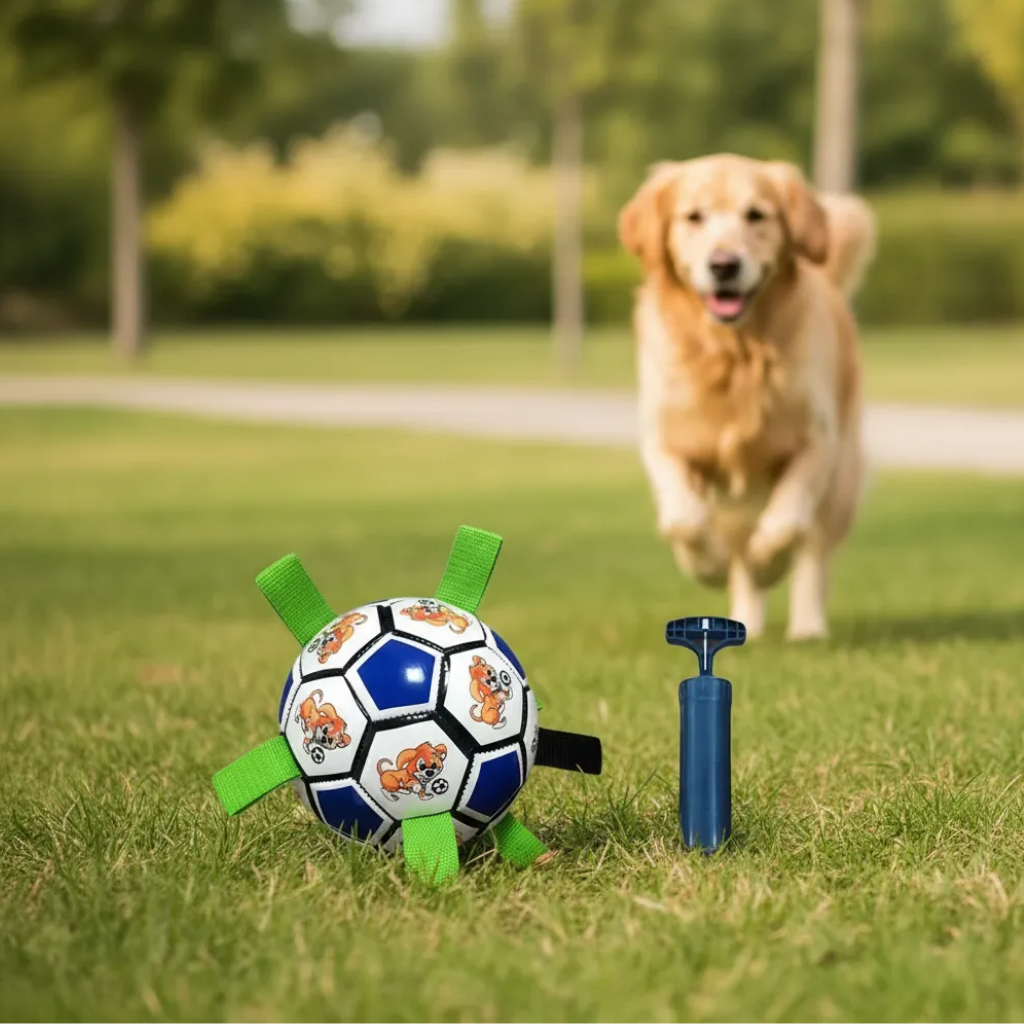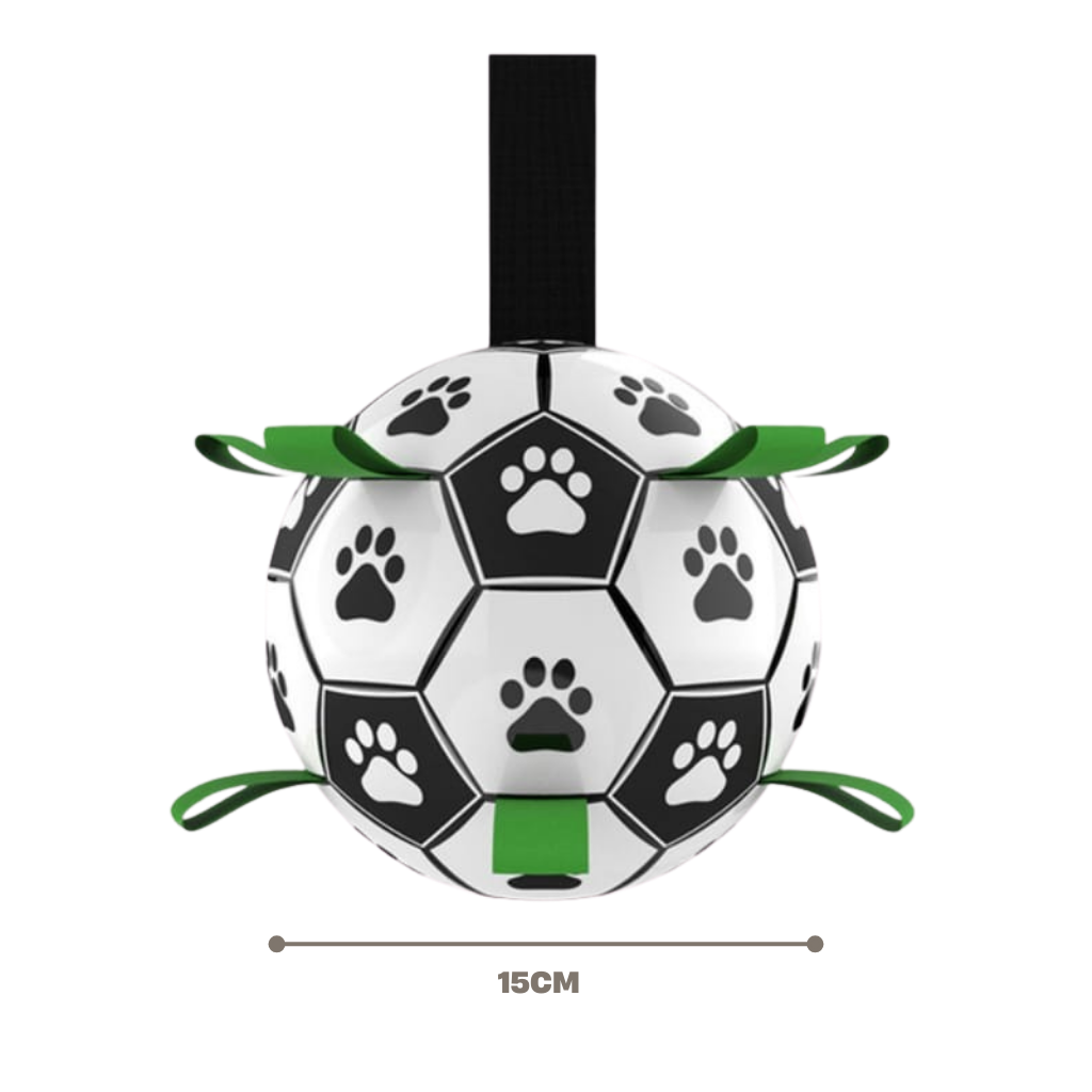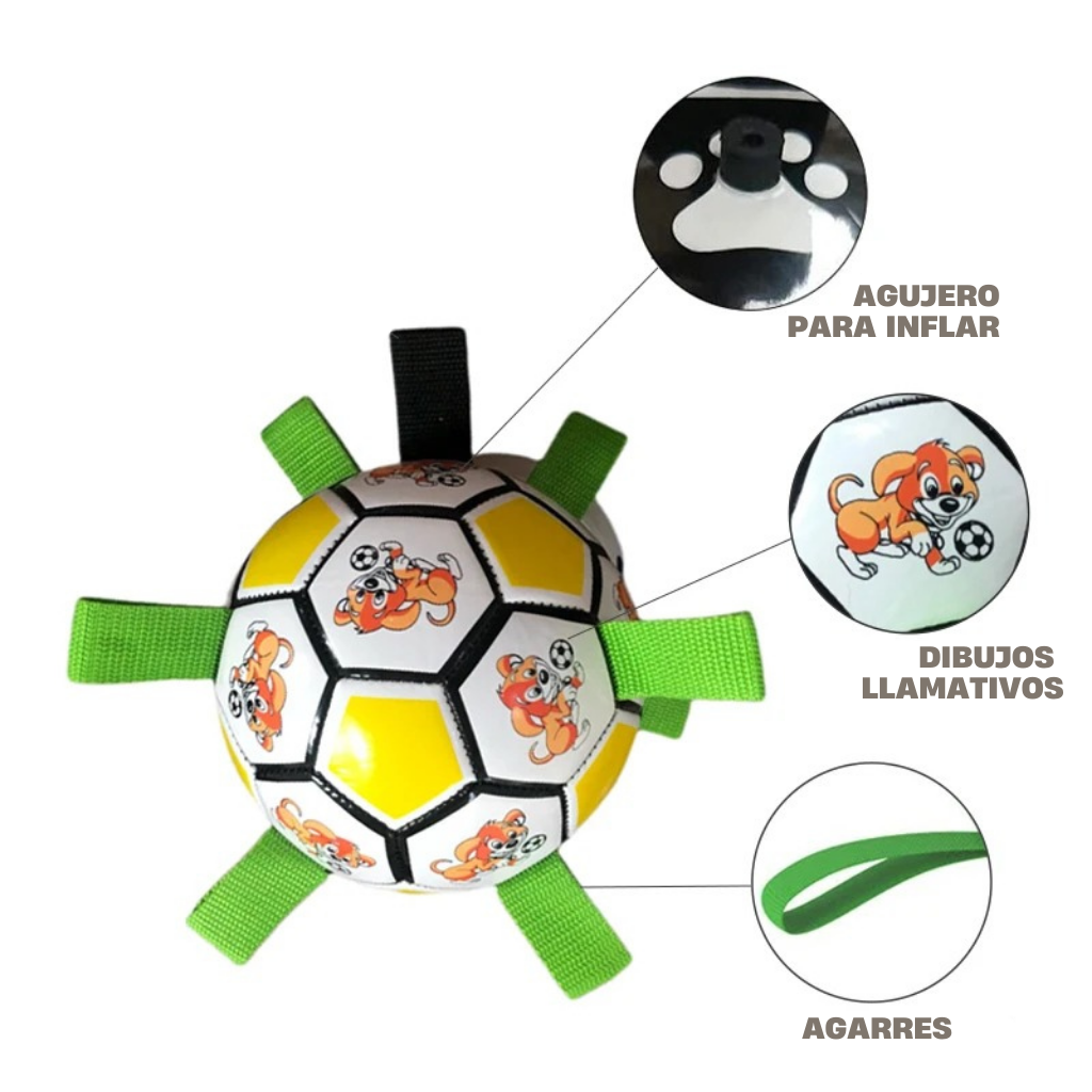Pelota de fútbol con múltiples agarres. Las pestañas no solo crean un rebote errático que a los perros les encanta perseguir, sino que también hace que sea más fácil para los perros buscar, tirar y recuperar. Además estos agarres facilitan que puedas jugar con tu perro a cinchar y tirar la pelota, es un juguete interactivo ideal para entrenar a tu perro. También se puede usar en el agua ya que es ligera y flota.
