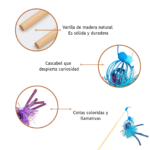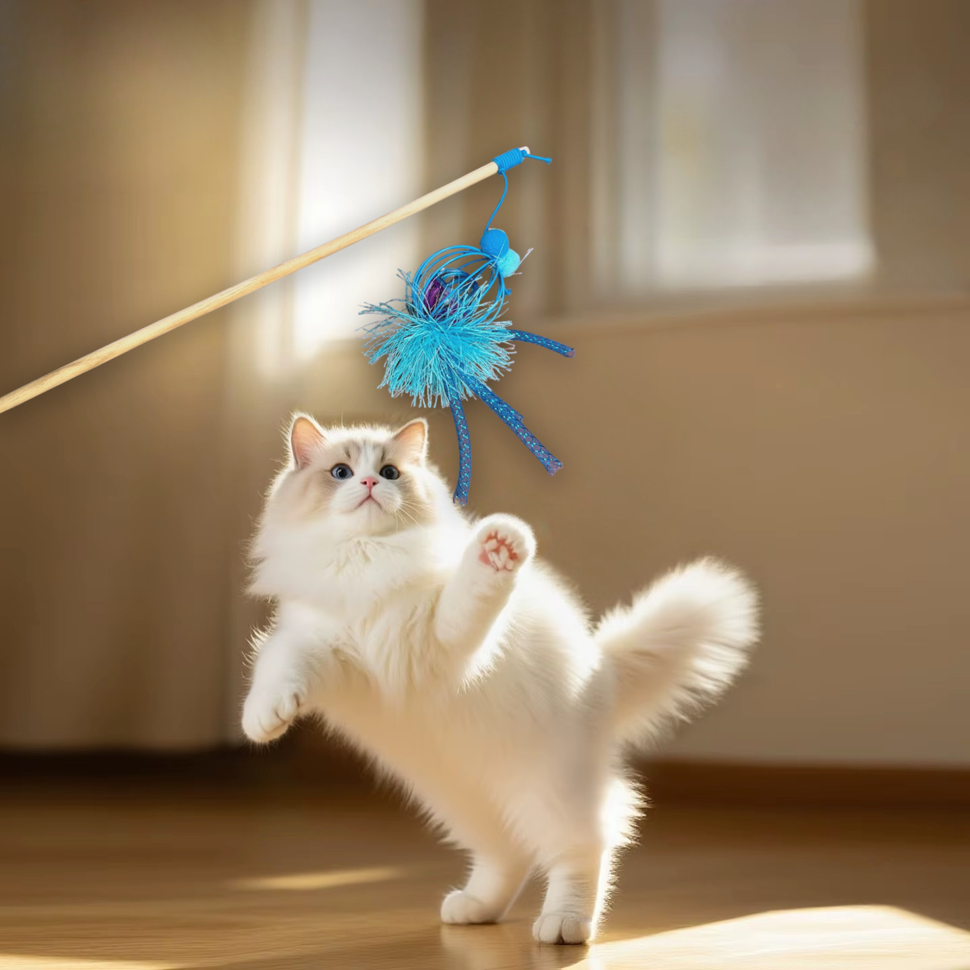 Incluye varias pelotas (con cascabel y de felpa) y cintas de colores que se mueven y llaman su atención, invitándolo a saltar, correr y perseguir. Su varilla liviana permite jugar cómodamente y compartir momentos de diversión, ayudando a reducir el estrés y el aburrimiento.